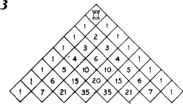 Разрезав шахматную доску по диагонали и повернув половину, мы получим треугольник, изображенный на рис. 3. Числа, стоящие в клетках любого ряда, указывают число кратчайших путей, ведущих в них из самой верхней клетки. Расставленные в клетках числа образуют знаменитый арифметический треугольник Паскаля, и это не удивительно: алгоритм для подсчета числа кратчайших путей, ведущих от вершины, в точности совпадает с процедурой построения треугольника Паскаля. Этот изоморфизм позволяет считать исходную головоломку прологом к изучению необычайно разнообразных и красивых свойств треугольника Паскаля.