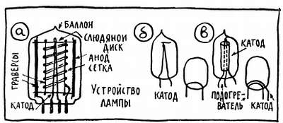 Внутри баллона все электроды объединены в одну жесткую конструкцию. Они закреплены на металлических стойках — траверсах, как бы зажатых между двумя слюдяными дисками (рис. 36, а). В центре находится катод, а вокруг него на двух траверсах навита управляющая сетка, которая, правда, уже давно для простоты выполняется в виде спирали (рис. 35, б). Поверх управляющей сетки-спирали, также на двух траверсах, закреплен анод — круглый или сплюснутый цилиндр, а иногда и прямоугольный короб. В лампах такой конструкции электроны двигаются к аноду во всех направлениях, пути электронов напоминают лучи солнца на детском рисунке.