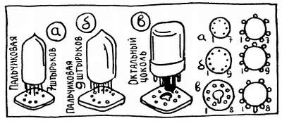 Несколько лет тому назад наша промышленность освоила новую конструкцию ламп, которые из-за сравнительно небольших габаритов были названы пальчиковыми. Сейчас эти лампы стали самыми распространенными. В пальчиковых лампах роль цоколя выполняет стеклянное дно, в котором закреплены контактные штырьки. Выводы электродов приварены к штырькам внутри баллона.