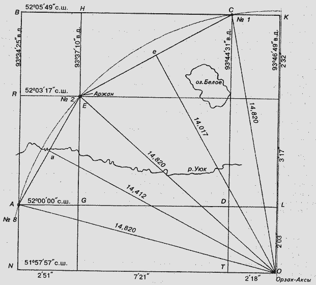 Радиус окружности – 14,820 км. Это чисто весьма приметно в космологической архитектуре и геодезии. Оно есть стократное увеличение диаметра эклиптики плюс лунной прибавки. Это число встречалось в Египте и в Стране Городов, а теперь – в Туве. Любопытно, что отрезок Оа при этом равен не менее важному числу 14,412 км (оно на 12 м длиннее стократного диаметра эклиптики).