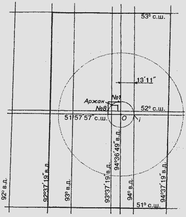 С восточной стороны от меридиана 92°37'19" в.д. строится геодезический квадрат размером 2°х2°. Его северная сторона – параллель 53° с.ш., южная сторона – параллель 51° с.ш. (как у квадрата Стоунхенджа), а восточная сторона – меридиан 94°37'19" в.д. Курган Аржан установлен на меридиане 93°31'10" в.д. и параллели 52°03'17" с.ш., т.е. близок к пересечению диагоналей геодезического квадрата (как Великая Пирамида) – в его геодезической середине (рис. 145).