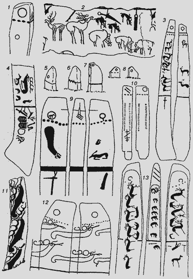 Рис. 147. Оленные камни Тувы. 7 – д. Сосновка; 2 – Аржан (в развороте); 3,10 – Орзак-Аксы (10 – схема); 4 – второй туранский камень; 5,6,8 – оз. Белое близ Аржана; 7 – д. Уюк; 9 – Самалгатай; 11 – Большой Ажик; 12 – Чингатаг; 13 – Уюк-Аржан (1-4, 9-13 – по эстампажам Аржанской экспедиции; 5-8 – по: J.soc. finno-ougr., 1907, t.24, p. 17-29). (По М.П.Грязнову.)