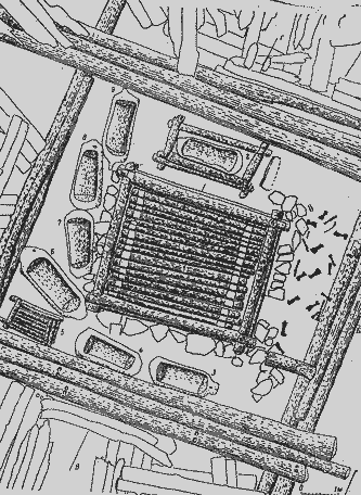 Рис. 152. Проектирование внешних контуров срубов. (Топография по М.П. Грязнову.)