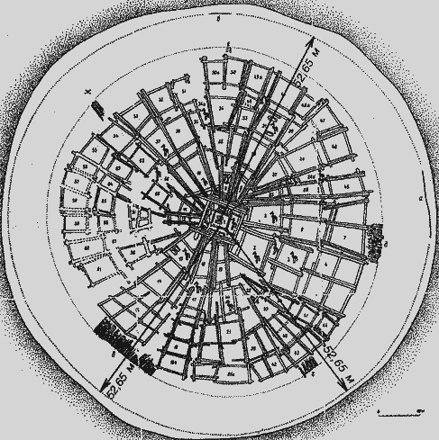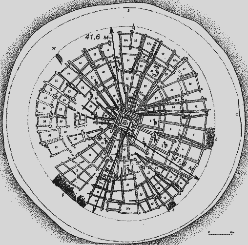 Контур внутреннего деревянного откоса описывается тремя дугами с радиусами 41,60 м. Центры этих дуг расположены в углах (северо-западном и юго-восточном) центрального сруба и в могиле № 4 (рис. 151).