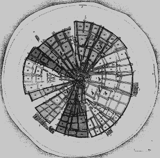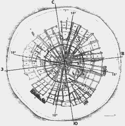 Внешние контуры срубовой конструкции также могут быть описаны дугами (9 дуг) радиусом 41,60 м с центрами в различных точках центральных срубов (в основном – в углах) (рис. 152).