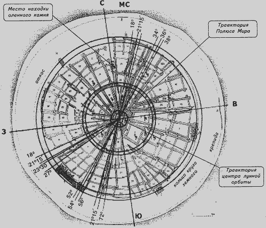 Магнитное склонение в Туве восточное, со значением около 8°. Восстановив положение истинного меридиана центра внутреннего сруба Аржана, можно обнаружить, что он (меридиан) был зафиксирован строителями. Дело в том. что в северной части кургана меридиан проходит через радиальный коридор (рис. 153) (помещения № 35, 34а и 51. В помещении 34а (Грязнов называет помещения термином "камера") найден "оленный" камень.