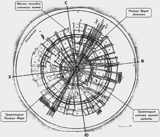 Рис. 154. Астрометрическая основа конструкции Аржана (1° = 58,5 см) – роль эклиптики выполняет крепида. (Топография по М.П. Грязнову.)