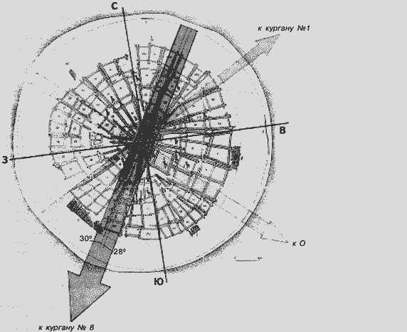 Сразу бросается в глаза, что центральные срубы повернуты относительно системы координат. Чем вызван такой поворот? Ответ лежит на поверхности: большой сруб повернут на 30° от меридиана, а малый сруб на 27° – 28°. Продолжение направлений срубов к юго-западу пройдут через курган № 8. Это направление в конструкции маркируется коридором в северо-восточном секторе и захоронениями коней в камере 17 (рис. 155).