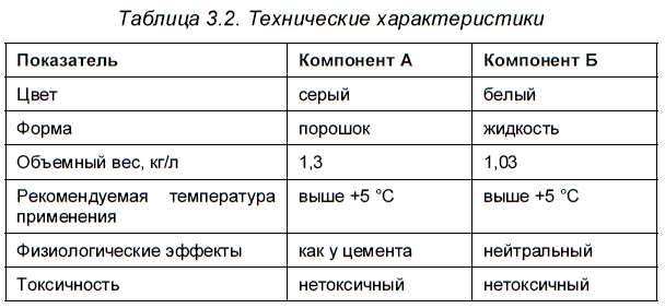Раствор готовится из 5 частей компонента А, 1 части компонента Б и 1 части воды. Перемешивание осуществляется вручную или бетоносмесителем на малых оборотах. Равномерный пластичный состав через 10 минут готов к применению. «Барраластик» легко наносится кистью или валиком в 2 слоя по 0,75-1,0 мм каждый. Интервал между нанесением слоев — 1–2 часа, а на высыхание всей системы потребуется 1–2 дня в зависимости от температуры и влажности окружающей среды. Эффективность гидроизоляции обеспечивается, если раствор сохнет не слишком быстро, поэтому нанесенный раствор следует предохранять от сильного ветра и прямых солнечных лучей. Основные технические характеристики приведены в табл. 3.2.