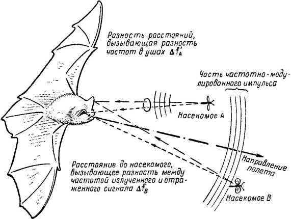Сам процесс обнаружения объектов насекомоядной летучей мышью еще полностью не выяснен и изучается. Что касается объектов на удалениях до 1–1,2 м, то предполагается, что мышь может различать сигналы от нескольких из них. Как показано на рис. 7, сложение излучаемых импульсов, модулированных по частоте, и отраженных сигналов дает сигналы разностной частоты ?f, которая будет пропорциональна расстоянию до объекта. Длительность сигналов разностной частоты также функция расстояния.