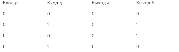 Все, что нам теперь нужно, это разобраться, как сконструировать подобное с помощью тех ячеек, что уже есть в нашем распоряжении: И, ИЛИ, НЕТ, НЕТИ и ЭИЛИ[240]. Если вы посмотрите на паттерны единиц и нулей, образующиеся в a и b, то заметите, что они выглядят знакомыми: выход a идентичен тому, что получался у И-ячейки (p ? q), а b прекрасно соотносится с ЭИЛИ-ячейкой.