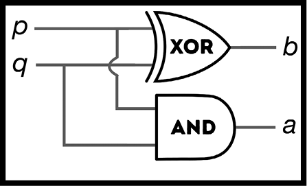 Теперь у нас есть два входа (представляющих два одноразрядных бинарных числа, которые вы хотите сложить) и два выхода (представляющих двухразрядное решение, снова выраженное бинарным образом). Мы поименовали их a и b, и вместе они кодируют то, к чему приводит сложение разрядов на входе.