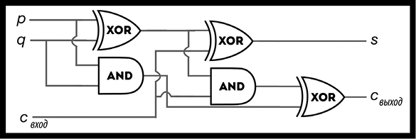В десятичн ой системе, к которой вы привыкли, 7 + 1 равно 8, 8 + 1 равно 9, но 9 + 1 дает уже двухразрядный ответ 10 вместо одноразрядного 9. Та же самая штука происходит в бинарной, только каждая новая колонка начинается не после 10, а после 2. Учитывая это, мы должны переименовать выходы a и b более аккуратным образом: давайте назовем их s (для «суммы») и c (для «переноса»).