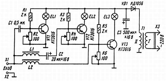 Фильтр L1, С2 пропускает сигналы средних частот. Баллон лампы EL2 окрашен в зеленый цвет. Режим каскада устанавливают переменным резистором R4. Сигналы нижних частот пропускает дроссель L2, который оказывает большое сопротивление сигналам средних и верхних частот. Режим устанавливают резистором R6, а лампа EL3 окрашена в красный цвет.