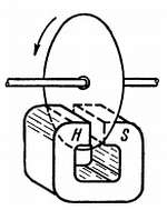 Рис. 141. Вращающийся в межполюсном зазоре магнита диск тормозится токами Фуко; чем выше скорость, тем больше сила торможения.