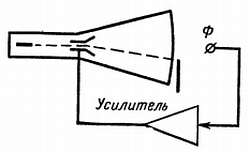 Рис. 144. Пример системы автоматического регулирования. Фотоэлемент Ф получает больше или меньше света с экрана электронно-лучевой трубки в зависимости от того, насколько пятно электронного луча перекрывается расположенной перед экраном картонной заслонкой; фотоэлемент управляет положением электронного луча.