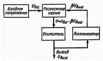 Как ты видишь, входное напряжение представляет собой не что иное, как разность между истинным входным напряжением Uвх и частью выходного напряжения βUвых. Часть выходного напряжения Uвых поступает на вход через аттенюатор с коэффициентом передачи β (меньше единицы). Полученное напряжение βUвых с аттенюатора поступает на один вход «разностной схемы», а на другой вход этой схемы подается входное напряжение Uвх.