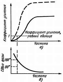 Рис. 146. На низких частотах усиление усилителя снижается (а), а сдвиг фазы увеличивается (б). На определенной частоте сдвиг фазы достигает 180°. Если на этой частоте коэффициент усиления меньше единицы (сплошная линия), то обратная связь не приводит к самовозбуждению. Если при повышении коэффициента усиления (пунктирная линия) он оказывается больше единицы на частотах, где произошел сдвиг фазы на 180°, то схема начинает генерировать.