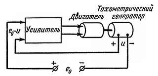 Рис. 147. Для поддержания постоянства частоты вращения двигателя на вход управляющего им усилителя подают разность между стабильным управляющим напряжением е0 и пропорциональным скорости напряжением и, которое выдает спаренный с двигателем тахометрический генератор.