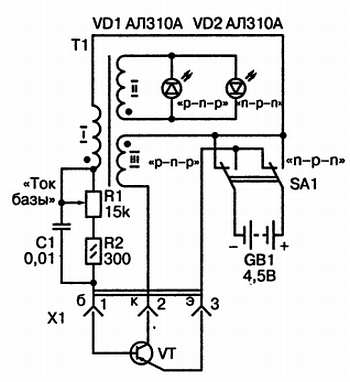 Значение статического коэффициента передачи тока базы испытуемого транзистора позволяет оценить переменный резистор R1 по положению его ротора, при котором возникает генерация. Светодиоды VD1 и VD2 сигнализируют о структуре транзистора благодаря тому, что от нее зависит полярность импульсов на обмотке II блокинг-трансформатора.