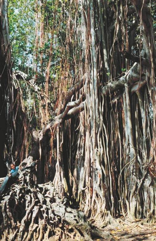 Огромный экземпляр бенгальского фикуса (или дерева баньян) и его огромные надземные корни.
