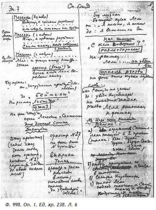 Замечу, что в черновых набросках и ранних вариантах сцен «Списка благодеяний» ремарки прописывались подробно (и представляется бесспорным, что они обсуждались в разговорах с Мейерхольдом). Но эти пространные ремарки рассказывают об эмоциональном образе сцены, а не о ее пространственно-временном решении. Например:
