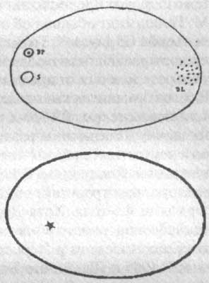 Рис. 43. Догонский рисунок системы Сириуса (вверху) и видимая траектория спутника звезды, согласно астрономическим наблюдениям (внизу).