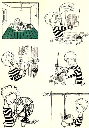 Уйдя от Дотошкина, Верхоглядкин сделал массу дел: покрасил пол, поставил замок на дверь, смазал электродвигатель вентилятора, подобрал в атласе чертежей подходящую деталь для поплавка, починил спираль электроутюга и провел электрическое освещение. Увидев плоды трудов Пети, Дотошкин схватился за голову. Может быть, вы подскажете почему.