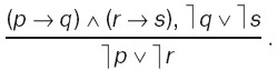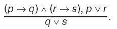 В простой конструктивной дилемме условная посылка содержит два основания, из которых вытекает одно и то же следствие. Разделительная посылка утверждает оба возможных основания, заключение утверждает следствие. Рассуждение направлено от утверждения истинности оснований к утверждению истинности следствия: