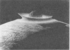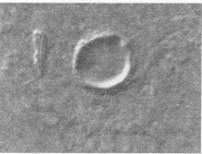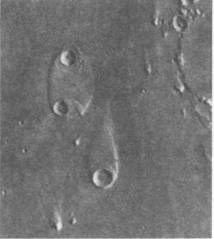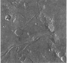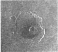 «Утес» и кратер. Обратите внимание на то, что линейная структура «Утеса» осталась незатронутой выбросом близлежащего кратера, как если бы она была сооружена после его образования. (Карлотто)