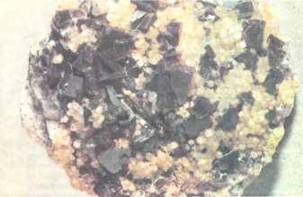 Друза темного флюорита (светло-желтый минерал — кварц)