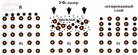 Сначала кремниевую пластину поместили в газовую среду, состоящую из атомов бора. Когда бор осел на поверхности кремния, образовав тончайшую пленку, поверхность стали облучать импульсами ультрафиолетового лазера большой мощности. Кванты ультрафиолета расплавляли поверхность кремния и как бы «утапливали» в расплаве атомы примеси. При этом кремний остывал столь быстро, что не успевал толкнуть атомы примеси обратно на поверхность. Они оставались словно «заморожены» внутри кристалла. И с каждым последующим импульсом количество атомов примеси все возрастало…