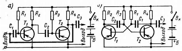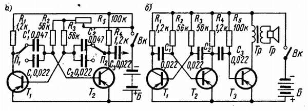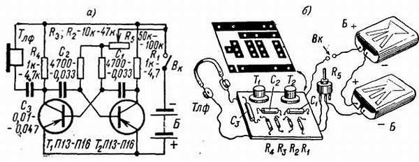 В отдельных случаях в качестве нагрузки в коллекторную цепь одного из транзисторов включается электромагнитное реле (см. например, рис. 32 на стр. 45) или другой прибор Итак, для сборки звукового генератора по схеме мультивибратора (рис. 3, а) понадобятся два одинаковых транзистора Т1 и Т2 (практически любые). Наиболее удобны триоды типа П13—П16.