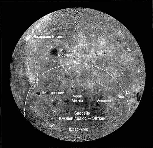 Рис. 3.37. Обратная сторона Луны. Пунктирной линией отмечена примерная граница Бассейна Южный полюс — Эйткен