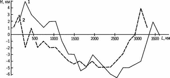Рис. 3.38. Профили Бассейна Южный полюс — Эйткен с севера на юг (1) и с запада на восток (2). Данные В. В. Шевченко и В. И. Чикмачева (ГАИШ).