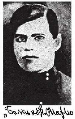 Анархист, бандит, убийца для одних и воин-поэт для других — таким разносторонним человеком вошел в историю Нестор Махно. Типичное женское воспитание, умение «схватывать все на лету», дерзость, упрямство и жестокость отражены в подписи круглым почерком, левым наклоном письма, отдельными буквами как штыками. Его маленький рост, тщедушность, дерзость отражены в подписи бессмысленным увеличением отдельных букв «Б», «т», «н» как комплекс неполноценности. Общая форма подписи отражает харизматичность человека, его лидерство. Использование кавычек в подписи подчеркивает, с одной стороны, скромность человека, с другой — скрытность характера. Левый наклон и доминирующая округлость букв говорят о возможной сентиментальности романтической натуры Нестора.