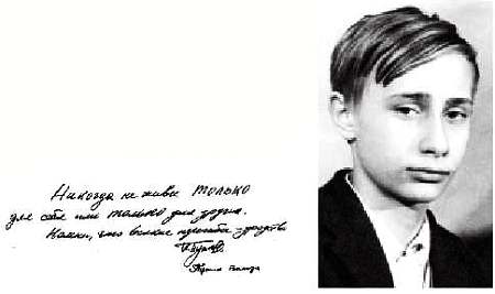 В этой связи анализ подписей разных лет позволяет довольно точно дать не только характеристику человека на данный период, но и представить сравнительный анализ его личностных характеристик за определенный период времени. Поскольку чаще всего в литературе по графологии приводятся примеры с подписями разных лет Наполеона, в нашем случае будет представлен подробный анализ почерка и подписей разных лет президента России В. В. Путина. Первая подпись и прилагаемый к ней почерк относятся к школьным годам будущего президента. Такая подпись говорит об открытости и доступности человека. На одной из вечеринок по случаю дня рождения своей одноклассницы В. Путин написал пожелание и оставил подпись. Графологический анализ показывает состояние личности Путина школьника. Особенностью почерка является округлость букв (женское начало воспитания), четкость расположения текста говорят о логическом мышлении, о высокой работоспособности. Отдельные удлинения букв «у», «р», «д», «в» говорят о наличии комплекса и упорства в достижении цели. Наличие системы самовоспитания и самоорганизованности проявляются не только в почерке, но и в подписи. В частности, точки в подписи говорят о предпочтении человека к умственному труду, об исполнительности и дисциплине. Однако нажим письма свидетельствует о том, что такому человеку не чужд физический труд, возможно, это спорт. Наличие иностранной буквы (см. нем. «W» в начале подписи) говорит о независимости суждений, о желании вырваться из заданной ситуации, достичь высоких результатов.