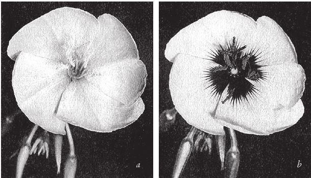 Рис. 8.1. (а) фото энотеры, Oenothra, сделанное при естественном (для человека) освещении; (b) тот же цветок, сфотографированный в ультрафиолетовом свете (видимом для насекомых и не видимом для нас), – в середине появился узор в виде звезды. Вероятно, этот узор указывает насекомым, где искать нектар и пыльцу.