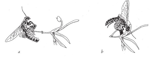 Рис. 8.3. Молоточковая орхидея, Drakaea fitzgeraldii: (а) оса садится на приманку; (b) шарнирный механизм срабатывает, и оса ритмично бьется спинкой о пыльник тычинки.
