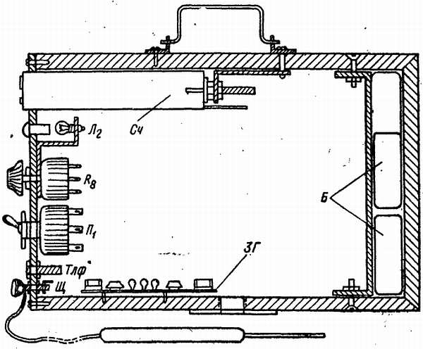 В правой части корпуса находятся две соединенные последовательно батареи, которые закрепляются при помощи металлической скобы. Расположение основных деталей внутри корпуса показано на рис. 52.