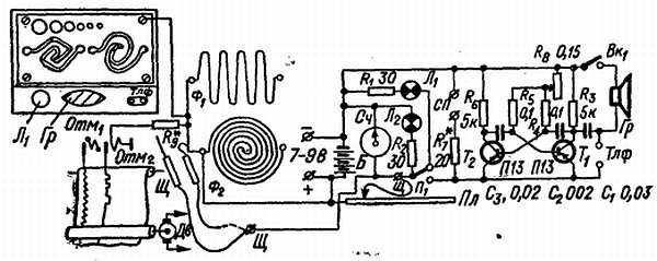 Схема звукового генератора рассчитана таким образом, что возможно отступление от номинальных значений (допуск) ±30 %. К звуковому генератору подключаются высокоомные головные телефоны или громкоговоритель.