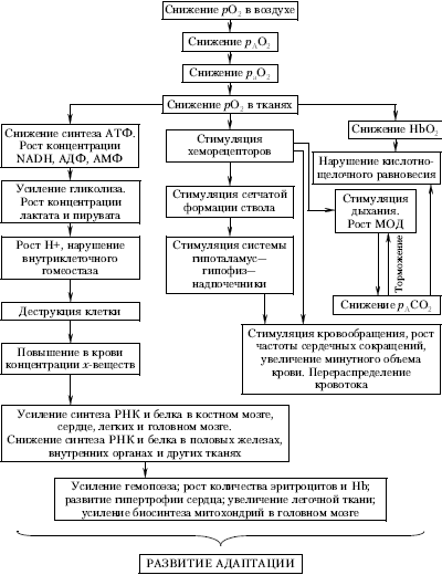 В патогенезе высотной болезни оказываются перекрещивающимися адаптивные реакции, направленные на «борьбу за О2», на улучшение транспорта кислорода к клеткам, и патологические реакции, обусловленные дефицитом кислорода. Эти реакции можно представить в следующей последовательности. Дефицит кислорода в окружающей среде приводит к снижению парциального давления в альвеолярном воздухе и артериальной крови. Снижение парциального давления в артериальной крови приводит к раздражению хеморецепторов рефлексогенных сосудистых зон (синокаротидной и аортальной). Усиление импульсации (афферентации) с хеморецепторов является началом многих рефлекторных адаптивных реакций, определяющих повышение минутного объема дыхания, минутного объема крови, стимуляцию гипофизарно-надпочечниковой системы и надбульбарных образований головного мозга, включая и кору полушарий большого мозга (рис. 3.5).
