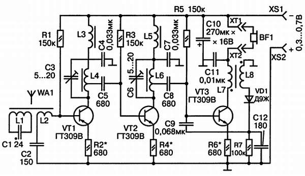 Входная цепь приемника образована магнитной антенной WA1. Колебательный контур L1, С1 настроен на частоту выбранной радиостанции, a L2 — катушка связи. Конденсатор С2 препятствует замыканию постоянной составляющей тока базы VT1 на землю. На транзисторах VT1 и VT2 собраны одинаковые каскады усилителя радиочастоты с контурами в цепях коллекторов L4, С3 и L6, С6, а также с развязывающими фильтрами L3, С4 и L5, С7. Во избежание ухудшения добротности контуров сигнал снимается с отводов катушек. Резисторы R2 и R4 служат для увеличения входных сопротивлений транзисторов. На транзисторе VT3 собран рефлексный каскад.