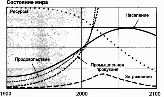 Поскольку точное численное выражение переменных не имеет особого значения, следует сосредоточиться на качественном виде (форме) кривых и на их различиях в разных сценариях. Тем не менее, важно помнить, что в сценариях, описывающих катастрофу, мы не можем точно описать, что произойдет после наступления кризиса, — этого никто не сможет предсказать. Каждый сценарий рассчитывается до 2100 г., но все, что происходит после резкого уменьшения (спада) какого-либо параметра модели, сколько-нибудь точно описать невозможно. Дело в том, что любой серьезный кризис в «реальном мире» сразу же приведет к тому, что многие важные допущения, на основе которых мы построили модель, станут несостоятельными.
