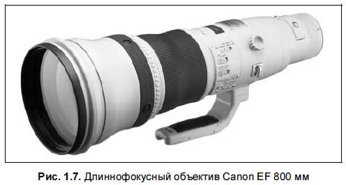 Но обычно фотолюбители имеют два-три объектива, остальные являются узкоспециализированными моделями, используемыми для решения конкретных фотографических задач. К примеру, вы вполне можете использовать объектив Canon EF 800 мм (рис. 1.7), однако на практике их использует сотня журналистов, поскольку такой объектив изготавливается вручную, по индивидуальному заказу за пару месяцев при 100 %-ной предоплате и стоит примерно 20 тысяч долларов.
