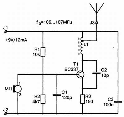 В отличие от других подобных устройств, в предлагаемом радиомикрофоне после микрофона не устанавливается низкочастотный усилительный каскад с варикапом, используемым в качестве модулятора. В данной конструкции частотная модуляция сигнала обеспечивается с помощью изменения рабочей точки транзистора генераторного каскада.