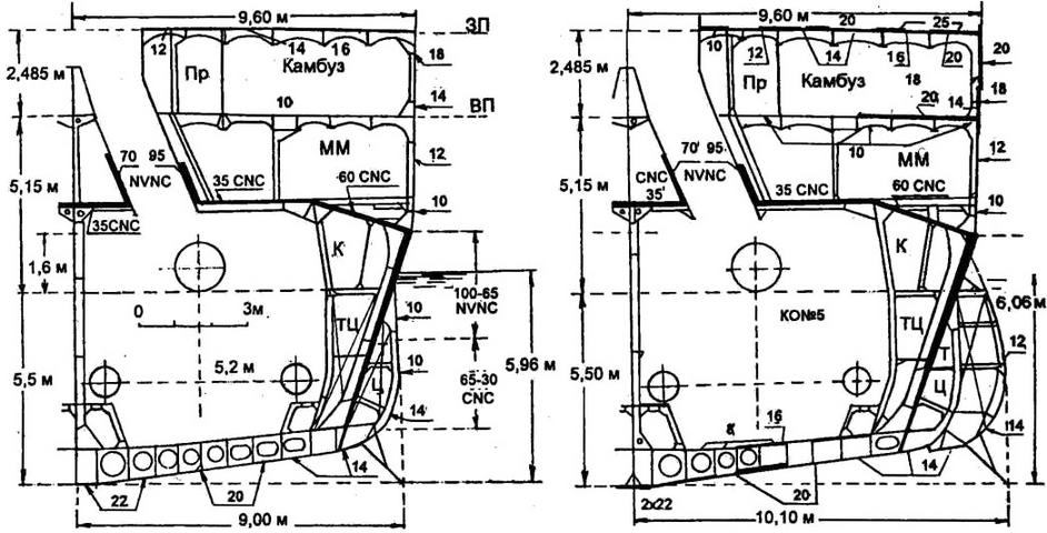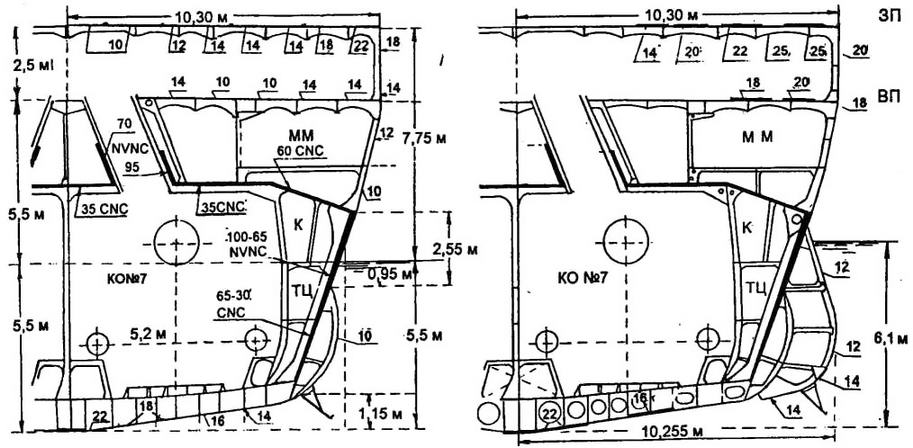 ММ - механическая мастерская, К - коридор для кабелей, ТЦ - топливная цистерна; толщины плит брони и набора в мм