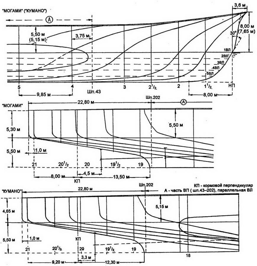 “С-37" “Могами’/“Микума” “Судзуя” “СудзуяТКумано” Дата 1931 июль 1935 1937/38 ноябрь 1935 1937 1939 Длина полная, м 200.6 200.6 200.6 200.6 200.6 200.6 Длина по ВЛ. м 197.0 198.3 198.3 198.02 198.06 198.06 Длина между/ п.п.. м 189,0 189.0 189.0 187,8 187.8 187.8 Ширина максим./ по ВЛ. м 18,0/18,0 18,0/18.45 20,51/19,152 18,0/18,0 20.2/19.2 20,2/19,2 Ширина шельтердека, м 20,6 20,6 20,6 19,2 19,2 19,2 Высота от киля до ВП, м 10,75 10,75 10,75 10,455 10,455 10,455 Средняя осадка, м* 5,5 6,15 6,1 5,96 6,058 6,043 Высота борта над ВЛ** нос/середина/корма, м 8,0/5,5/5,3 8,0/5,5/4,9 8,0/5,5/4,9 7,65/5,15/4,65 7,65/5,15/4,65 7,65/5,15/4,65 Водоизмещение: стандартное, Т / нормальное, т 9500/11169 11200/ 12962 12400/14112 -/12450 -/13881 12000/13844* оценивалось для нормального водоизмещения на испытаниях с 67% запасов;