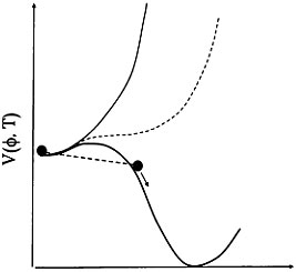 Сценарий Гута начинается с очень плотного и очень горячего зародыша Вселенной. Откуда этот зародыш взялся — отдельный вопрос, многократно обсуждавшийся. Например, микровселенная может появиться как результат редкой (но не безнадежно редкой) квантовой флуктуации. Важно, чтобы зародыш расширялся (по закону Фридмана) и чтобы все поля были в термодинамическом равновесии. Характерное время первой стадии сценария — 10-37 или 10-36 с, за это время зародыш расширился и остыл до 1016 ГэВ. Это важный момент, поскольку при такой температуре плотность энергии поля ? становится сравнимой с плотностью энергии частиц, а у эффективного потенциала поля появляется новый минимум, как показано на рис. 19.1. Это момент фазового перехода.