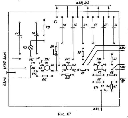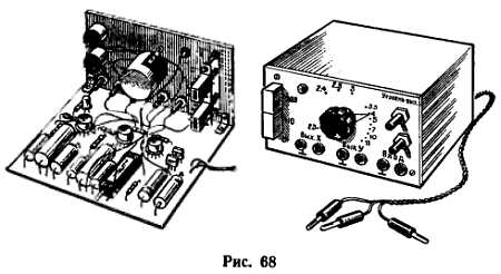 Часть деталей генератора смонтирована на печатной плате (рис. 67), а остальные размещены на лицевой панели (рис. 68) прибора — она скреплена с платой двумя металлическими уголками.